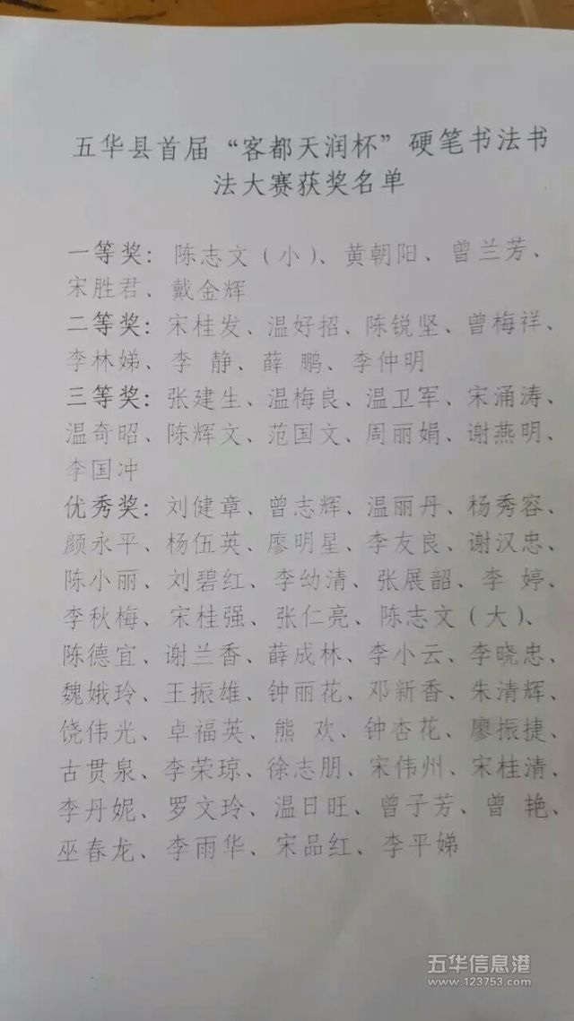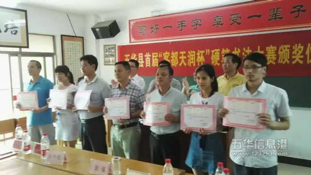 6月10日上午,五华县首届“客都天润杯”硬笔书法大赛颁奖仪式在长乐青少年书法培训中心举行。此次大赛征稿以来,广大书法爱好者踊跃投稿,共收到稿件238件,质量较高,通过评委们的认真评选,共评出一等奖5名,二等奖8名,三等奖10名,优秀奖47名。(五华硬笔书协)