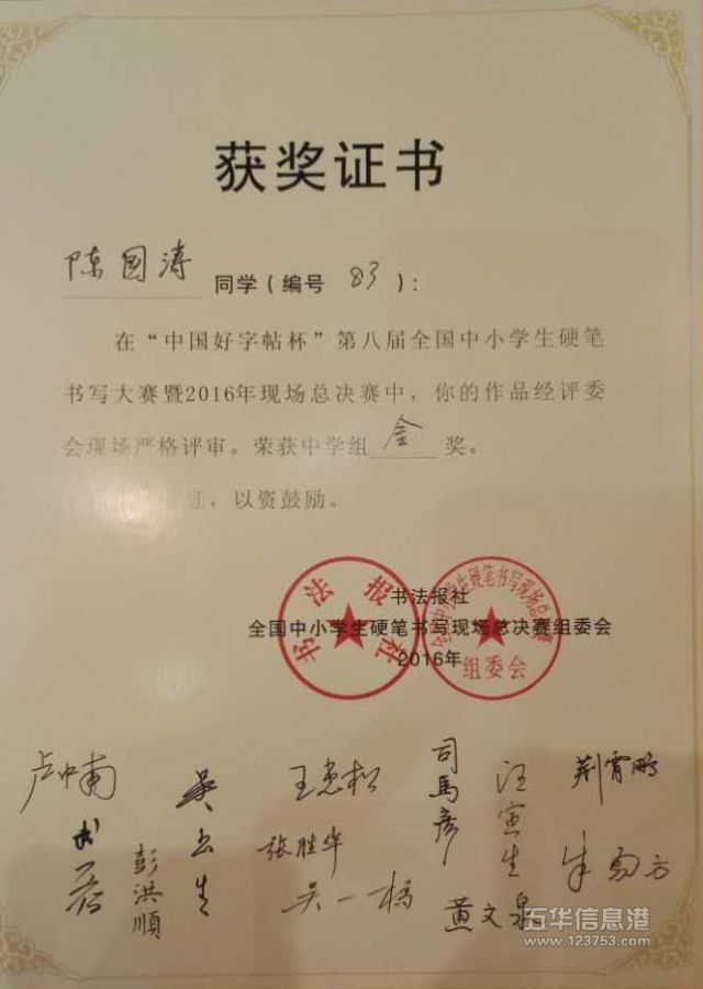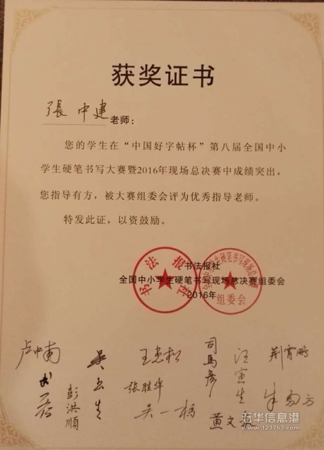 这些小书法家们不负众望,在张中建、李静、邓新香、李林娣、戴金辉、曾兰芳、李秋梅等书法名师的指导下,李姬辉、赖鹏有荣获特等奖;陈国涛等5人荣获金奖;范银杏等5人荣获银奖;张中建老师荣获“全国优秀书法指导奖”;长乐青少年书法培训中心荣获“优秀组织奖”。(五华硬笔书协)