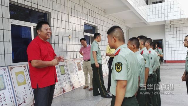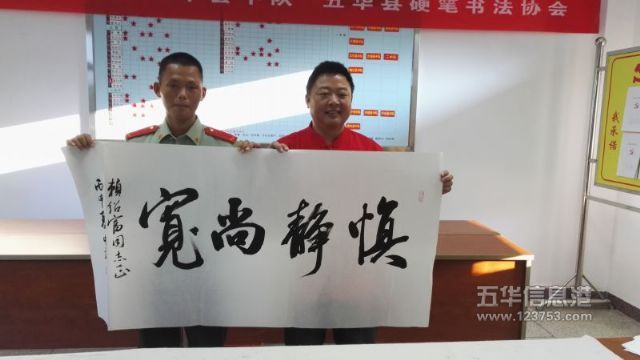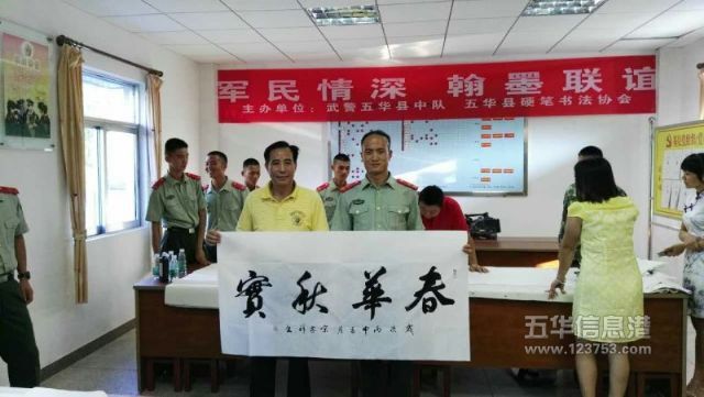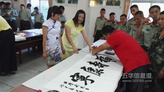 7月31日,县硬笔书法协会张中建主席、徐方海、宋家祥、黄敬德副主席、理事薛鹏、李林娣、周丽娟等来到武警五华县中队,送书法展进军营,挥毫赠字等方式,与部队官兵欢庆八一。