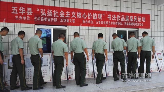 在武警中队,书法家向官兵赠送书法作品集和书法字帖,鼓励官兵们在练好本领的同时,努力学习,成为文武双全的战士。官兵们还观看了由县委宣传部、县文联主办的五华县弘扬社会主义核心价值观书法作品展。