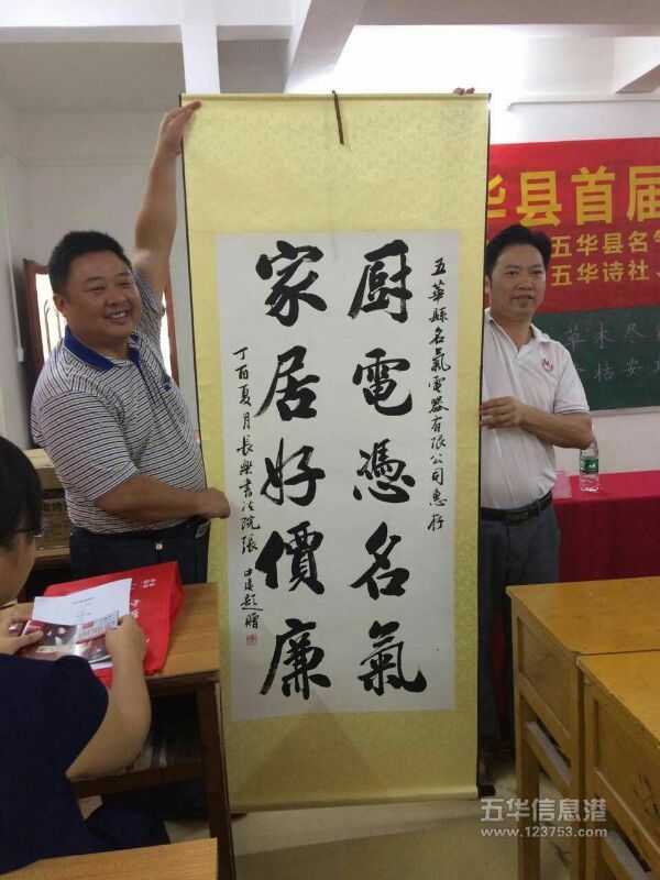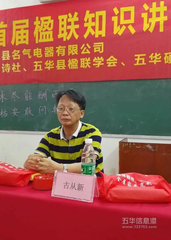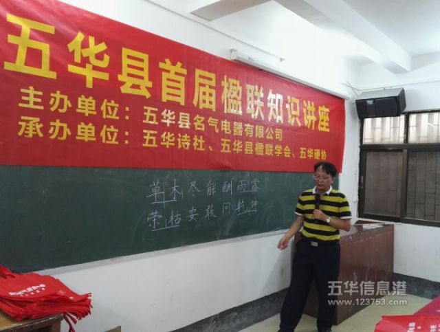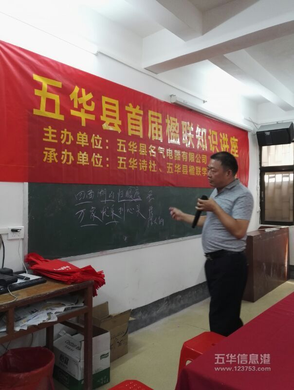 7月15日,五华县首届楹联知识讲座在长乐书法院举行。讲座由五华硬笔书法协会张中建主席主持,五华诗社古从新社长、五华楹联学会徐水宏会长作了精采讲座,五华名气电气有限公司宋国中总经理提供了丰厚的礼品和奖品,80多人参加了此次活动。