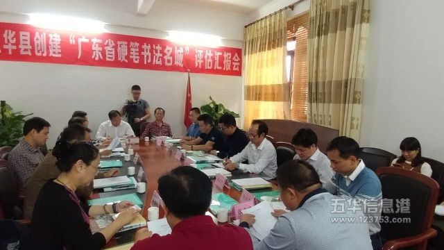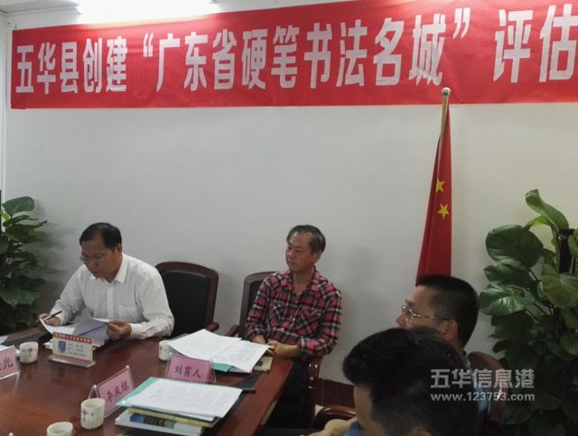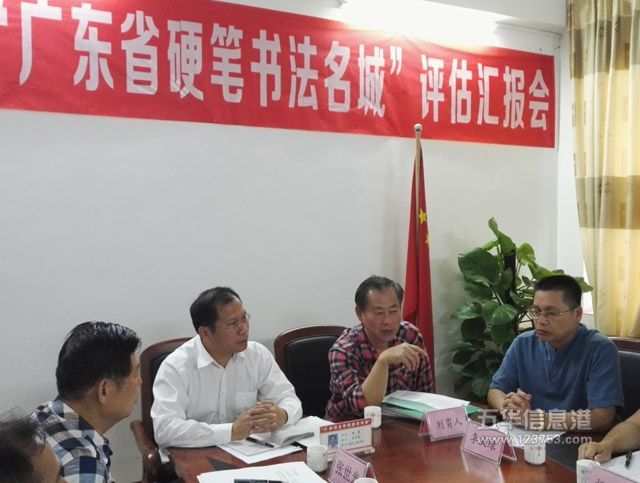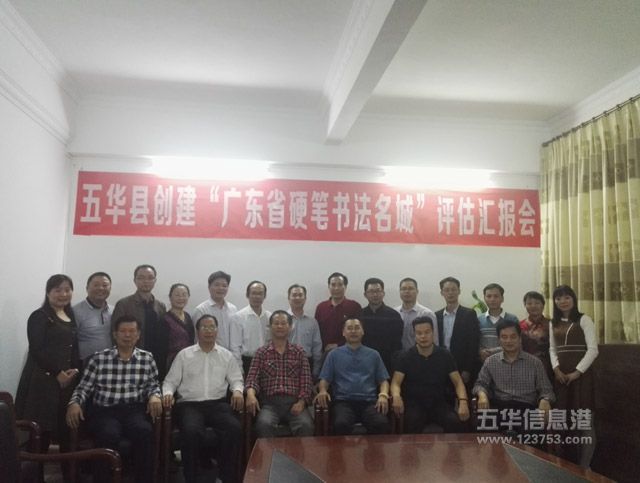 11月7日下午,五华县创建“广东省硬笔书法名城”评估汇报会在五华县政府举行。中国硬协荣誉副主席、广东硬协主席刘胄人,中国硬协主席团委员、广东硬协常务副主席兼秘书长李庆绿,广东硬协主席团委员杨忠德,广东硬协副秘书长金熙俊,梅州硬协常务副主席张世光、副主席吴伟平、张桂秋、张中建等,及五华县委宣传部常务副部长谢意、文广新局局长曾勇辉、教育局党组成员李玉琪,五华县文联主席张汉章主持会议。