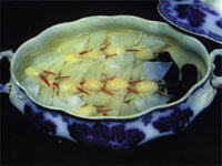 4. 鸭蛋清盛于碗内,打散,取铁勺一放在火上烧热取出。另取猪肥膘肉1小块,在勺内擦匀,然后舀入一匙蛋淮绕一圈,使之受热后凝成圆薄皮子,放入馅丸1个,将铁勺放中火上煎筷子将皮子摺成两具半圆形拢合状,并把裹在里面的馅丸夹一天夹成"玉蝉"表。铁勺离火,轻轻取出,按此制成20只。火腿肉切成长3厘米、半根火柴粗的丝40根,每只玉蝉头部均插上2根。制好与"灵芝"拼装于盘,上笼屉用旺火蒸1分钟取出,分别摆入汤碗的左右两边。