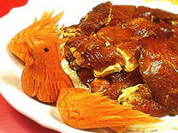 5、鸡炸好后马上切块,先切鸡头,后切鸡身,在碟上砌成鸡的原形,四周放上是片即成。食时跟糖醋,口急汁,淮盐。