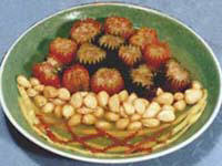 2、泡红椒在蒂部切口去瓤,填入肉馅,用湿淀粉封口,炸至8成熟捞出;底朝下码入碗内,撒上蒜瓣上笼蒸透,滗出原汁翻扣在盘中。 原汁加调料勾芡淋在红椒上即成。