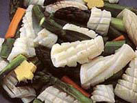 1、将鲜墨鱼改刀为长约10厘米、宽5厘米的块,从1/2处剞十字花刀,其余部分改为夹刀片后,顺刀切成鱼尾状。