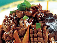 1.猪腰子平片成两块,去净油皮和腰臊,先反刀斜剞,再直刀剞成三刀一断的眉毛形,盐、湿淀粉码味上浆。黄瓜洗净,去瓤心,切成条。用盐、白糖、味精、酱油、醋、料酒、湿淀粉、鲜汤兑成滋汁。 2.锅中放油烧熟,放入腰花炒散,加姜、蒜、葱、泡红辣椒、黄瓜条炒匀,烹汁收汁,起锅装盘。