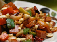 四川成都名菜。以鸡脯肉、花生米、干辣椒为主料炒制而成。成菜色泽金黄,鸡肉鲜嫩,花生米香脆,咸辣略带甜。