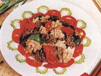 3、炒锅上旺火,放入猪油,烧至八成热,放入肚头、鸡胗,用筷子迅速划散,倒入漏勺沥油。炒锅内留油少许,下葱、姜、蒜未煸出香味,随即倒入鸡胗和肚头,并下芡汁,颠翻两下,即可出锅装盘。