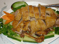 2、菜油旺火热至八成熟,放入鸭子炸至皮酥呈金黄色捞出,分部位砍成条,按鸭形摆盘内,刷上香油与葱、酱味碟同时上桌即可