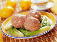 2、取一砂锅用熟猪油擦抹锅底,将菜心排入,倒入肉汤,置中火上烧沸,将拌好的肉分成几份,做成光滑肉圆,放在菜心上,上盖青菜叶,加锅盖,烧沸后移至小火焖约两小时即可。