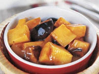 选用直径约3厘米的优质冬菇,去蒂洗净。笋时切成长3.5厘米、宽1.5厘米、厚0.1厘米的骨牌块。炒锅置旺火上烧热,用油滑锅后,下菜油,将笋块入锅稍炒,即放入素汁汤和冬