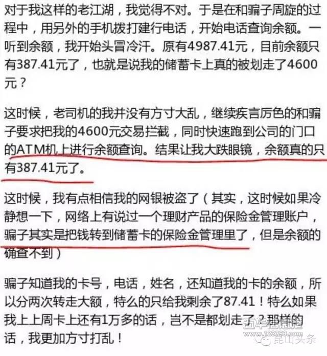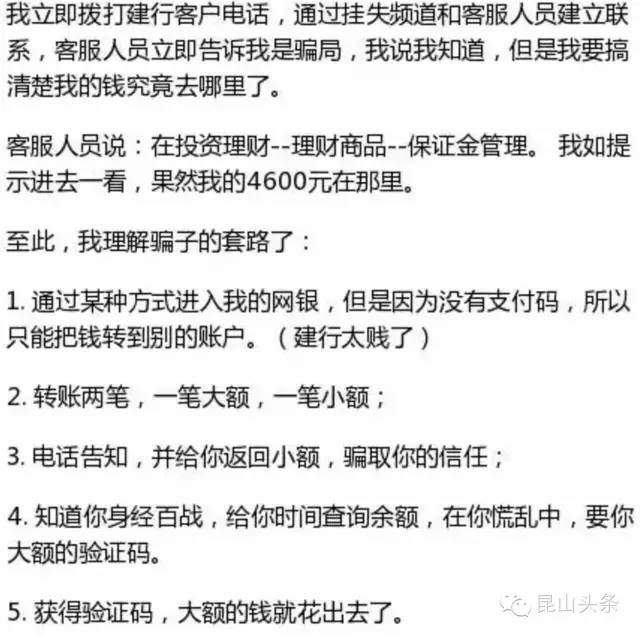 你转钱到投资理财账户的时候银行肯定会给你发信息,告诉你钱转出去了,这是正常的。但是仅仅是告诉你钱转出去的,转到哪里去了,银行并未告诉你!如果在这步银行多写几个字,写明转出去的目的地,这个骗术就很难成功了!