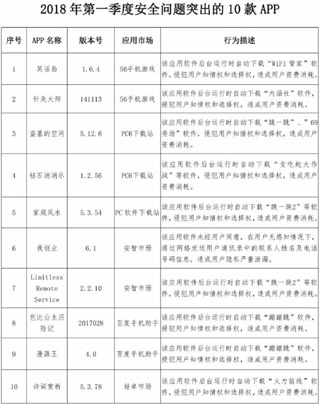 据了解,警方在清查中发现,“笑话岛”“针灸大师”“盗墓的空间”“钻石消消乐”“家庭风水”等10款APP存在窃取用户信息、在用户不知情的情况下自动下载软件、强行捆绑推广应用软件等突出安全问题,涉及56手机游戏、pc6下载站、PC软件下载站、安智市场等6个APP发布平台。