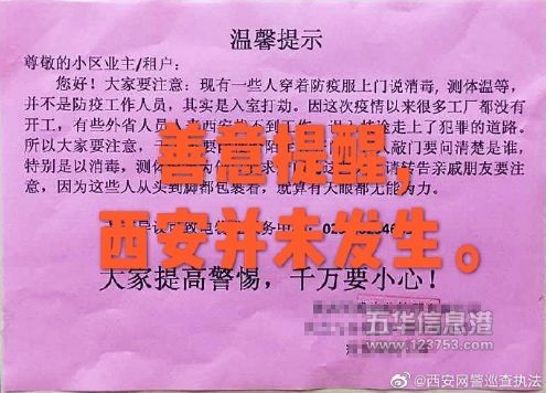 近期,广东、陕西西安、上海等地的某些社区张贴出“有假冒防疫人员入室抢劫的防范提醒”引发关注。图片经微信群传播,引起部分市民议论,造成了一定恐慌。